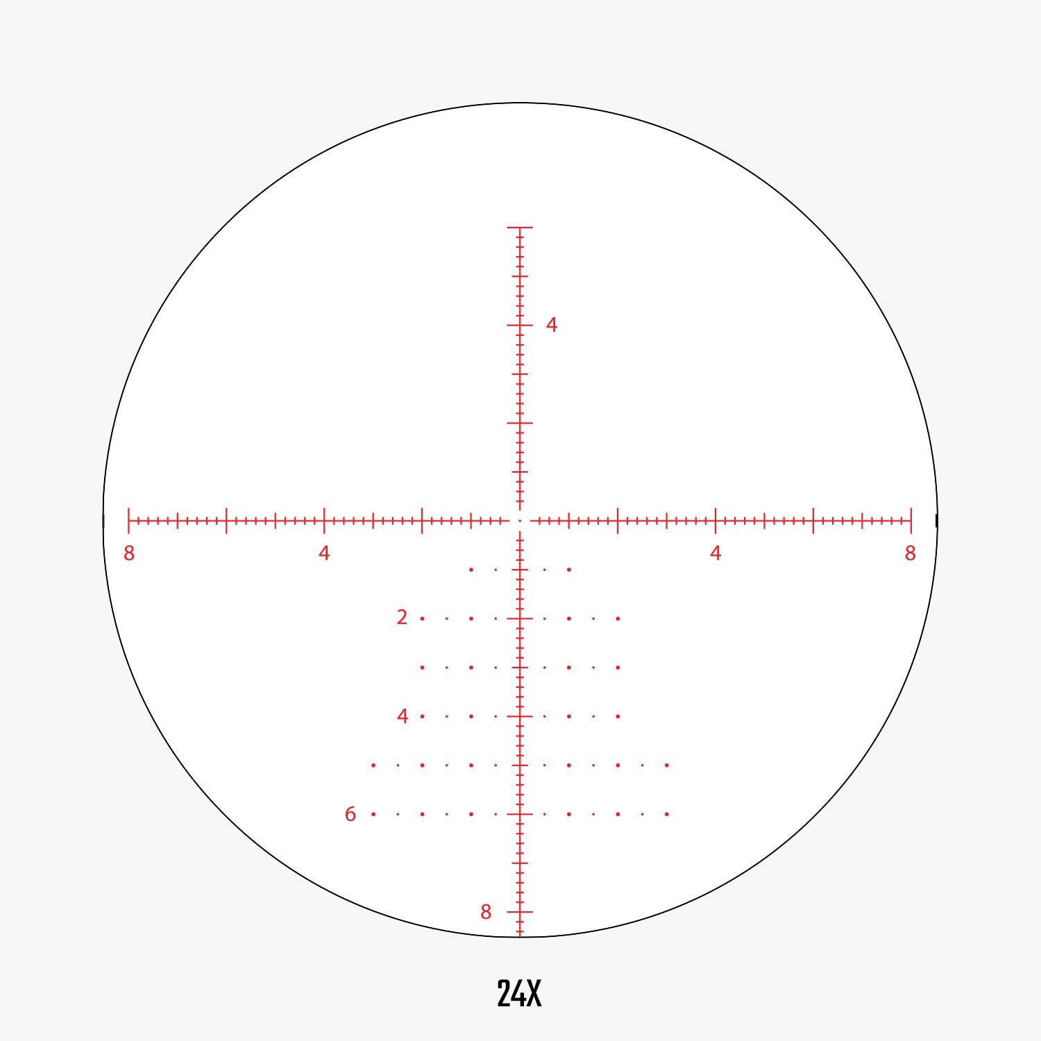 - APRS9 FFP IR MIL reticle — first focal plane design keeps subtensions accurate at every magnification, so your ranging and holdovers work whether you're dialed to 6x or 24x. The 0.04 MIL floating center dot provides a precise aiming point, and fine 0.2 MIL hash marks in all four directions let you quickly read wind corrections and elevation holds without dialing.