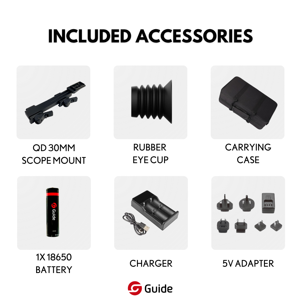 - 640×512 @ 12μm VOx Sensor with 25mK Sensitivity — The same proprietary uncooled vanadium oxide detector platform used across Guide's thermal lineup delivers genuine 640-class resolution at 12μm pixel pitch. At 25mK NETD, the TR 630-A produces clean, detailed imagery with excellent contrast between targets and background — more than enough sensitivity for reliable identification in any nighttime hunting scenario.