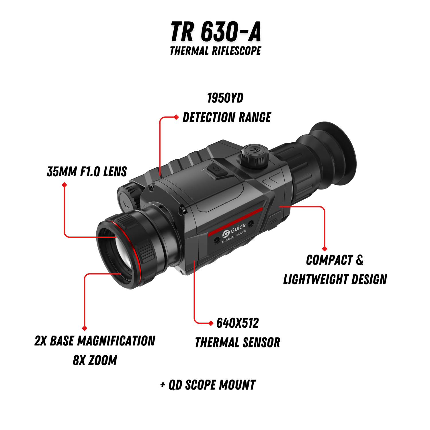The Guide TR 630-A pairs a 640×512 sensor with a compact 35mm F1.0 lens for the widest field of view in Guide's TR series — a lighter, faster-scanning thermal riflescope built for close-to-mid-range work in dense cover, thick brush, and tight shooting lanes where a wider perspective matters more than maximum detection range.