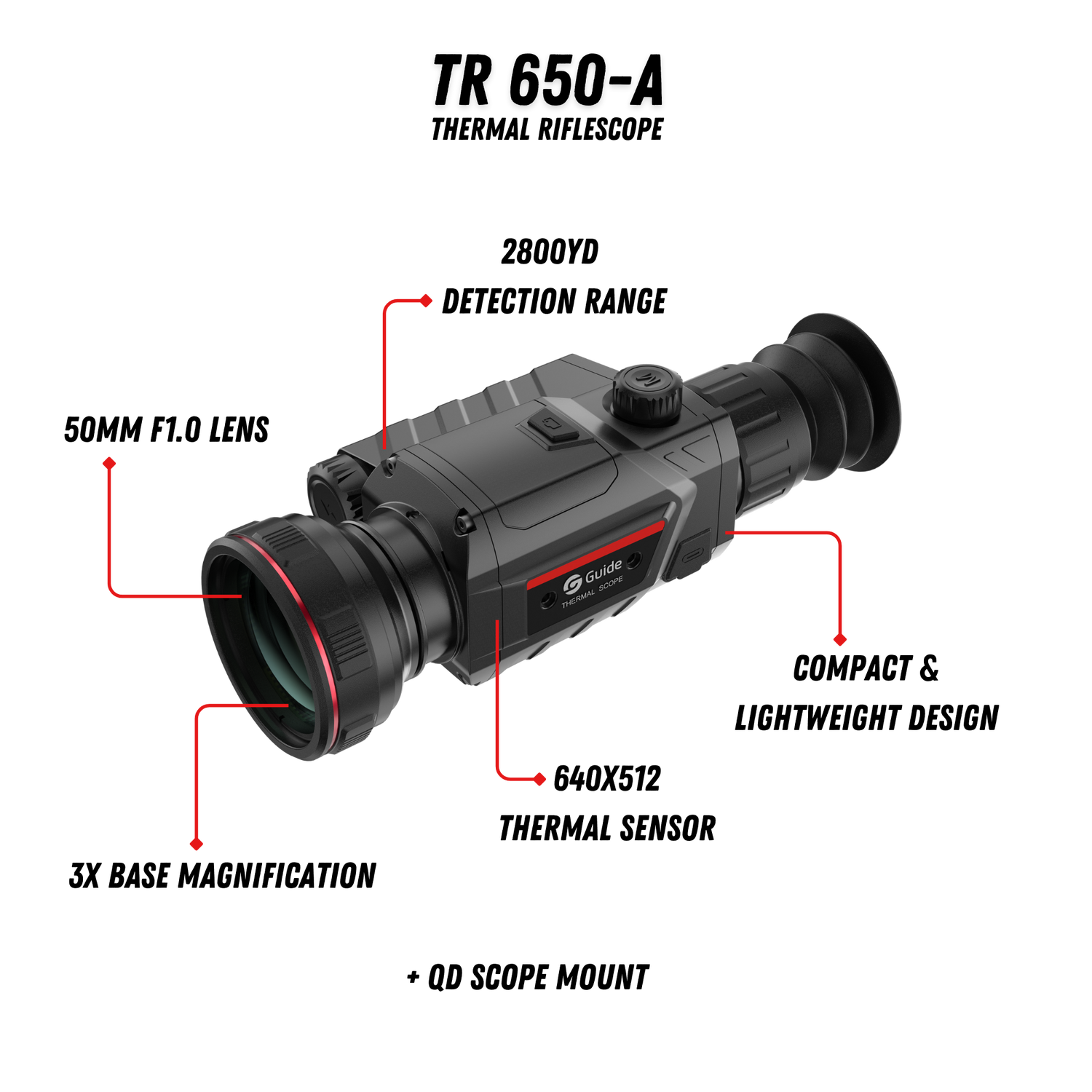 The Guide TR 650-A delivers 640×512 thermal resolution with ≤20mK sensitivity through a fast 50mm F1.0 lens — the same proprietary VOx detector technology that Guide manufactures for brands across the thermal industry, offered direct with a 10-year warranty and a US-based service center in Texas.