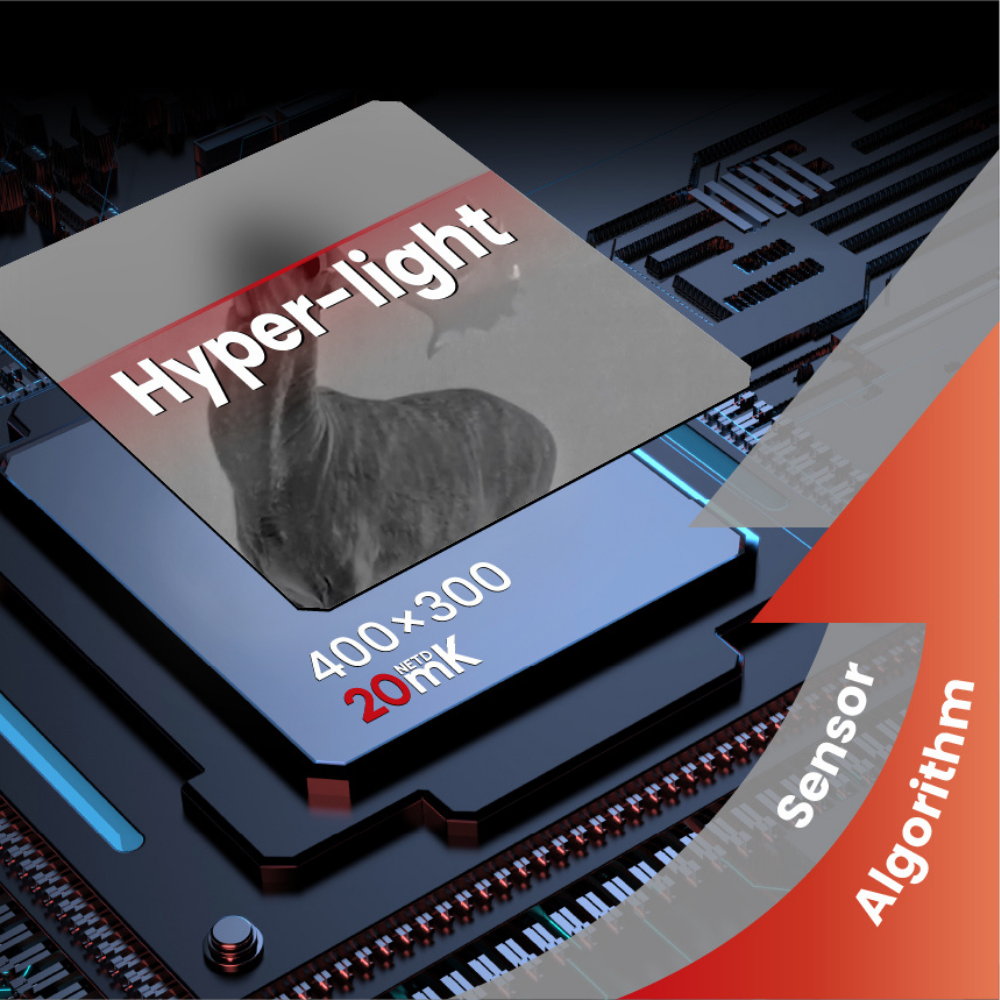 - 400 × 300 thermal sensor, 12 μm pixel pitch — 120,000 thermal pixels with ≤20 mK NETD deliver clean, usable imagery in complete darkness, fog, rain, and smoke, with a thermal detection range of 1,300 meters. Shutterless 3.0 calibration keeps the display live at 50 Hz — no freeze frames during recalibration.