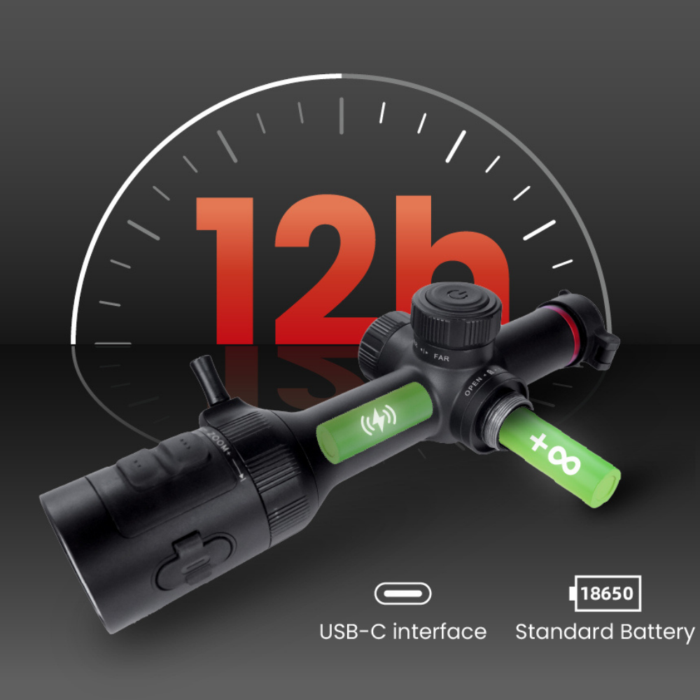 - 12-hour battery with hot-swap capability — a built-in 18500 rechargeable cell plus an external 18650 bay provide extended runtime with field-swappable power. Standard 18650 cells are available anywhere.